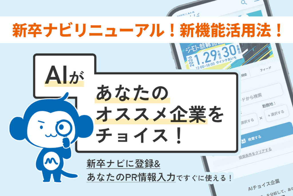 名大社の「新卒ナビ」のリニューアルに合わせて、生成AIを活用した新機能『AIチョイス』が誕生しました。志望業種や職種をはじめ、登録されたあらゆる会員情報をもとに、マッチング度の高い求人情報を提示できる機能です。
