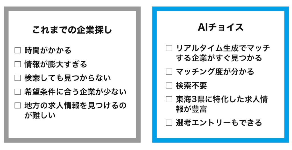 就職活動中は、自己分析やエントリシートの作成、企業研究など、さまざまなタスクを並行して進めなければなりません。やるべきことを整理し、効率よく進める工夫を取り入れて、よりよい結果に結びつけたいものです。『AIチョイス』は、タイムパフォーマンスの向上はもちろん、企業探しの精度も高めてくれるツールです。名大社が、皆さんへのエールを込めて取り組む新たなサービスを、ぜひこれからの就職活動にお役立てください。