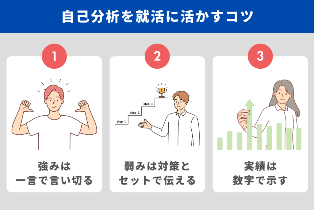 自己分析を就活に活かすためには、次の3つのコツを意識することが大切です。